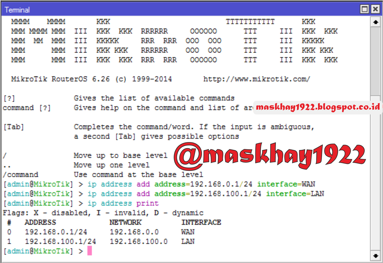 5. Berikan IP address pada ethernet WAN dan LAN, dalam tutorial ini IP WAN saya gunakan 192.168.0.1/24. Untuk IP LAN saya gunakan 192.168.100.1/24. caranya ketikan perintah :